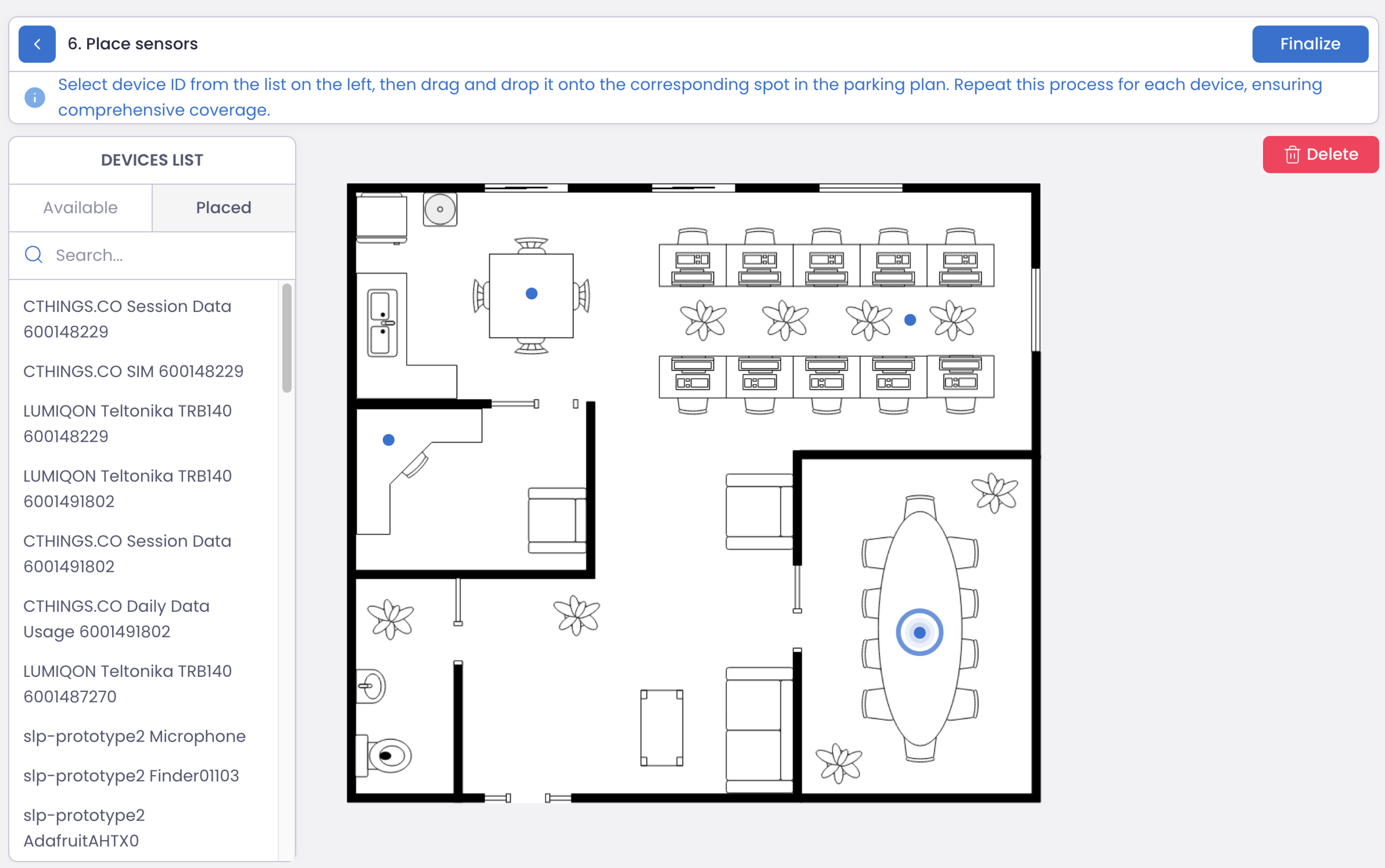 Review and Save: Once all sensors are positioned, review the floor plan and save your changes by pressing “Finalize” button on the top right.