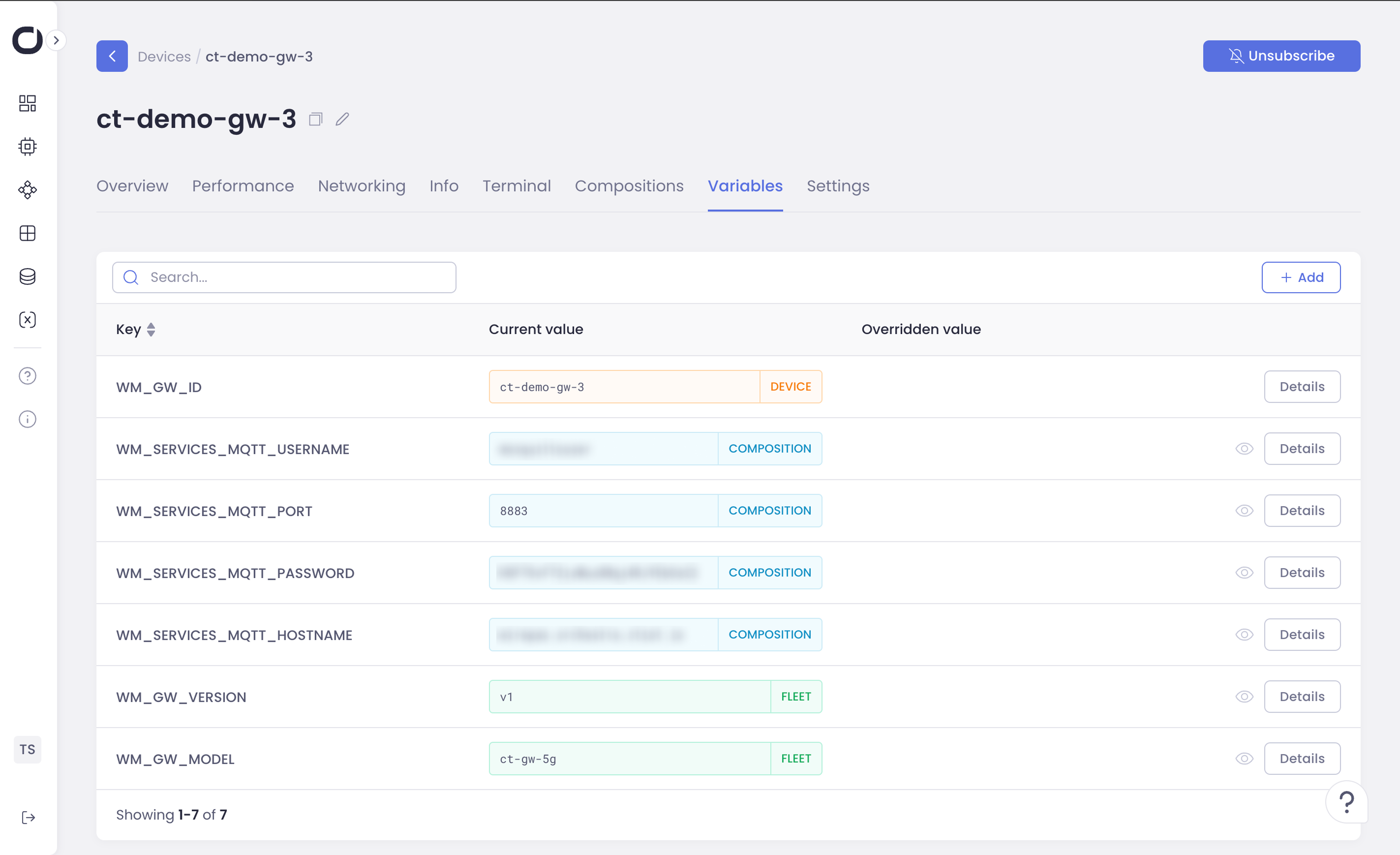 The Variables tab allows you to manage device variables, which are key-value pairs that can be used to configure compositions and customize device behavior. Variables provide a flexible way to adapt deployments to different environments and scenarios. From this tab, you can: